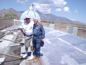 Pete Contreras and Ray Atchinson standing on the top of the roof of the Tabernacle.