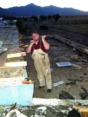Bod has joined in the effort of removing the built-up roof from the lobby section of the church/tabernacle.