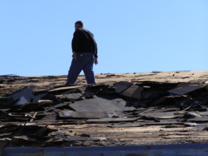 The entire roofing material is being removed from the building. Carol has taken the roof down to the bare wood.