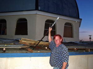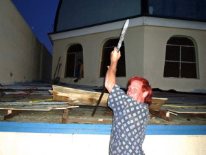 Even Dr. Harter is involved in the removal of the roofing material from the tabernacle.
