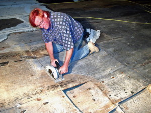 Some of the old built-up roofing material must be sawed off in sections. Even though it is getting very late, Bob continues to remove the old roofing material.